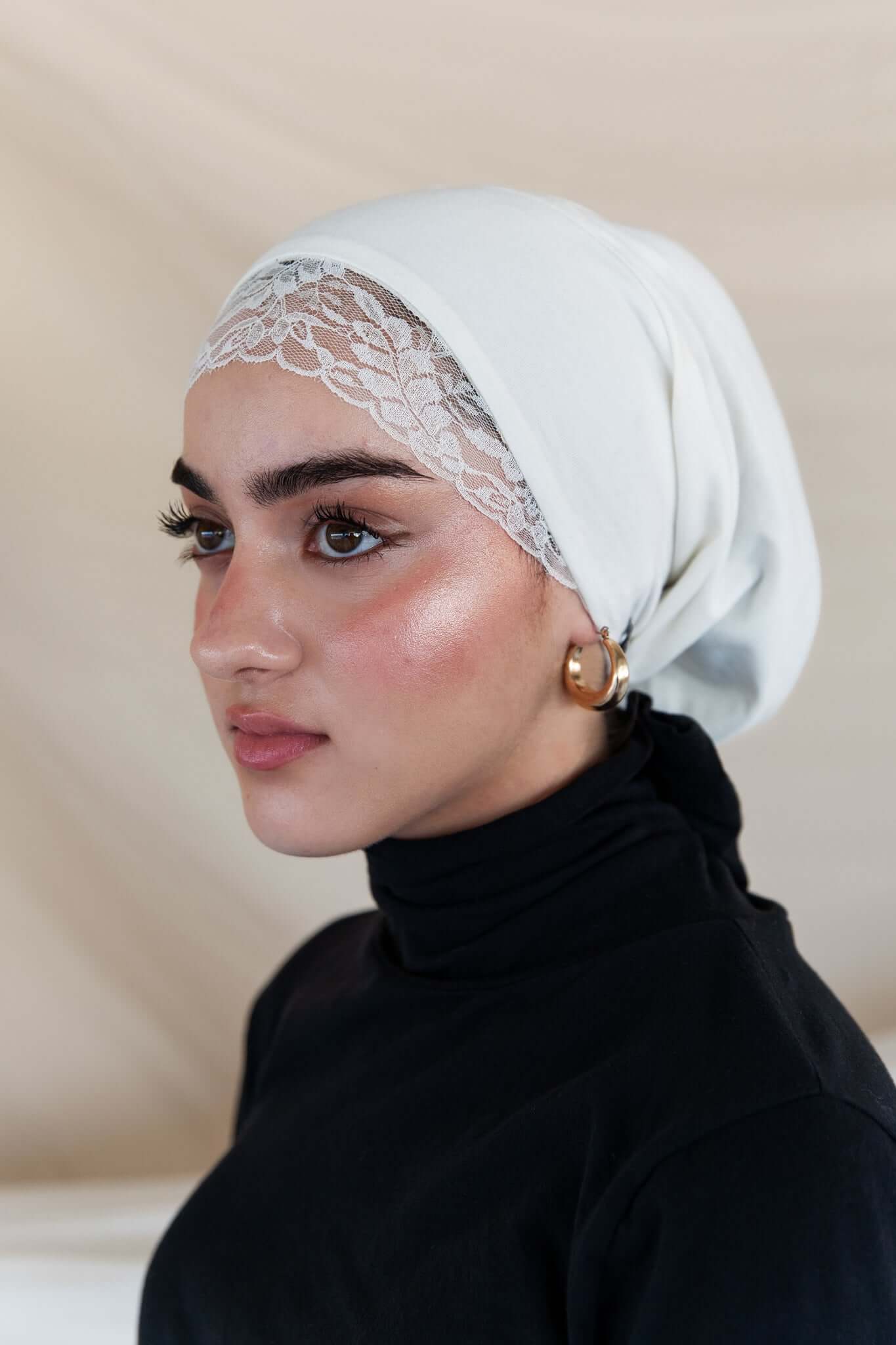 A lace bonnet looks the same as a tube hijab cap, but it’s made entirely of lace to offer breathability. It’s often a suitable choice for the summer because it keeps your head cool.