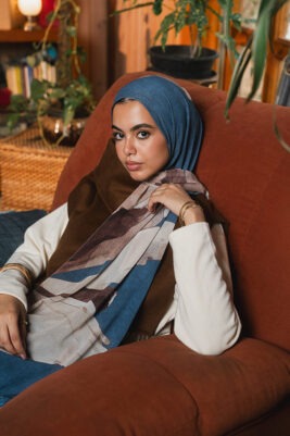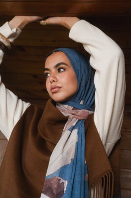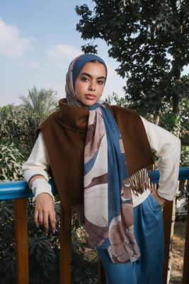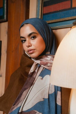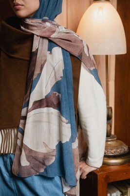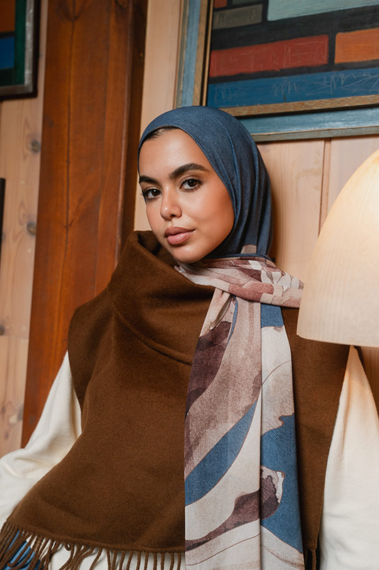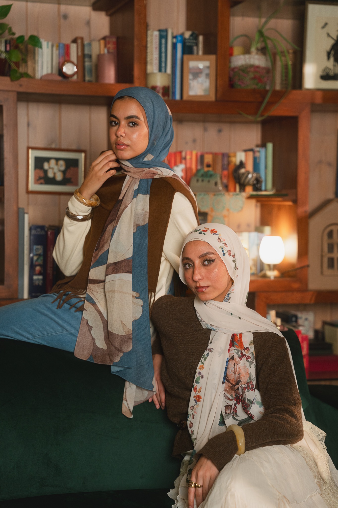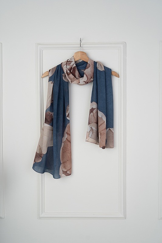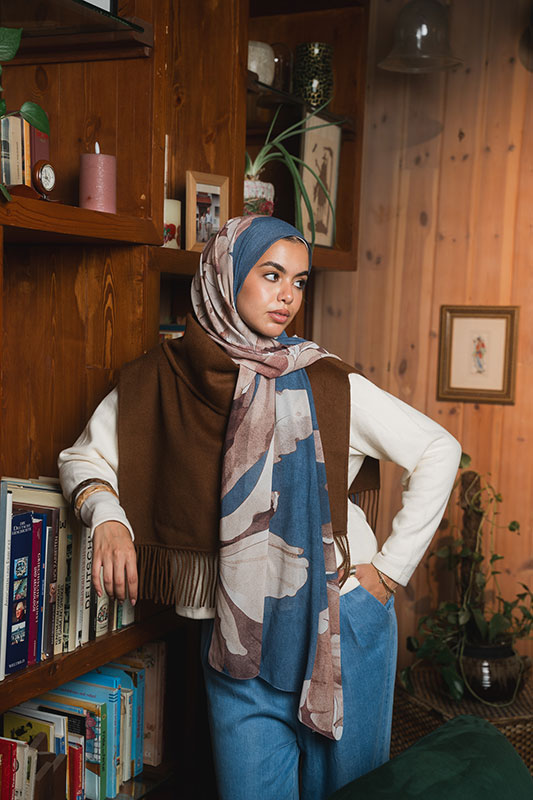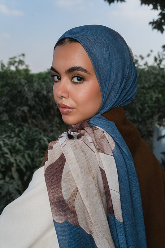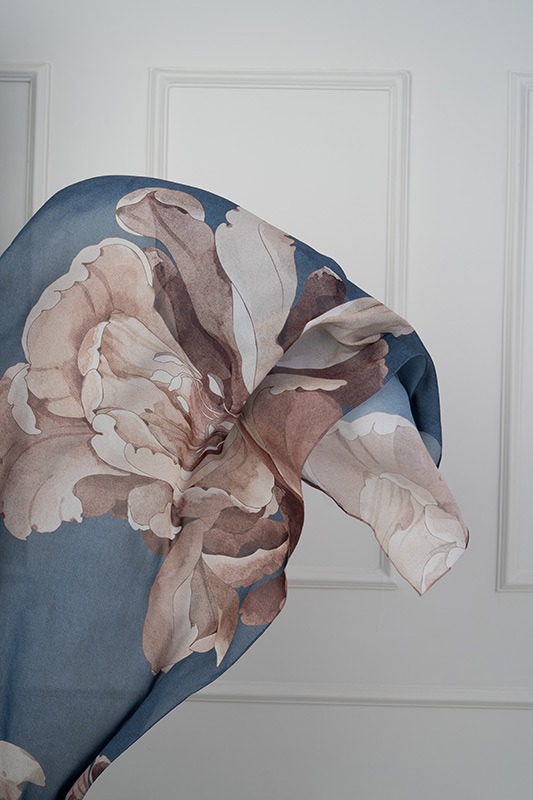 A modern reinterpretation of winter blooms, blending earthy taupes and florals with dusky blue. It’s bold, yet effortlessly wearable—perfect for winter pairings on denim jeans.