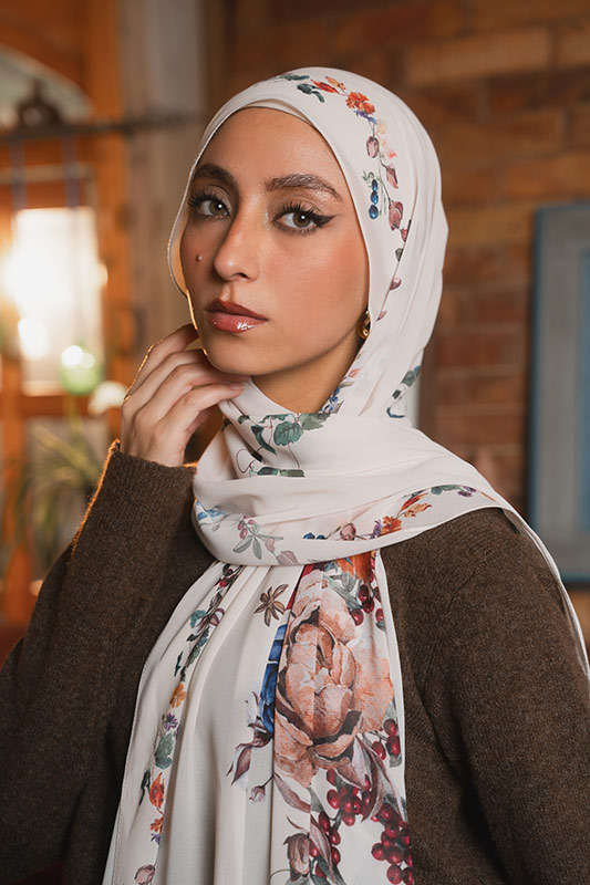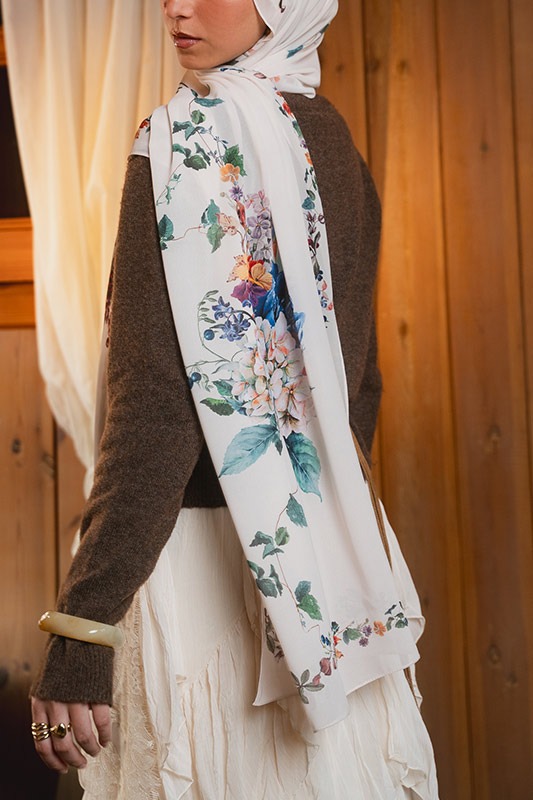 Meet Camellia’s winter sister: A gentle cascade of ivory chiffon kissed with warm watercolor winter florals. She’s romantic. She’s serene. She feels like morning light pouring through vintage curtains.