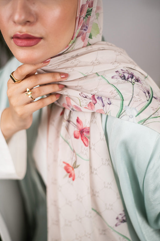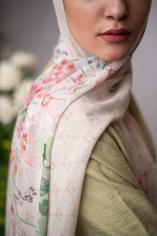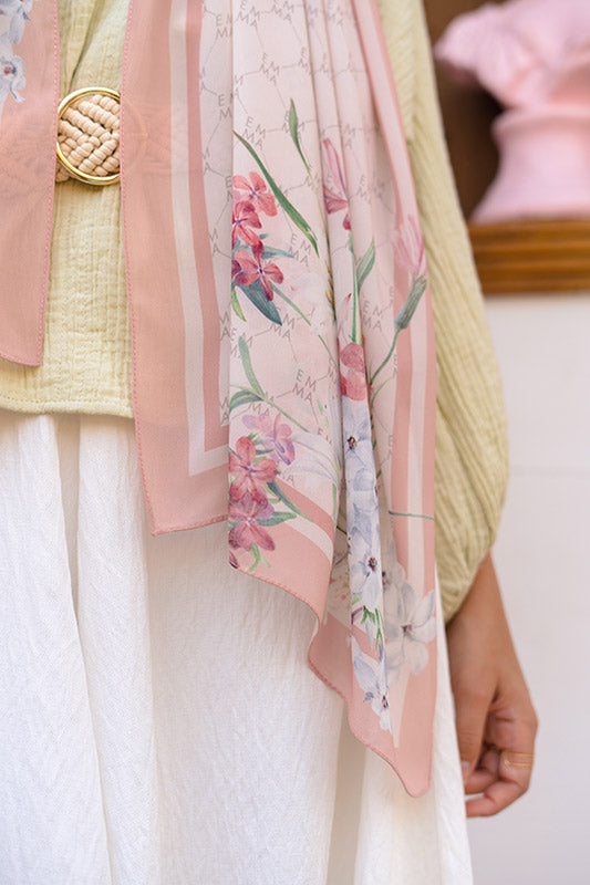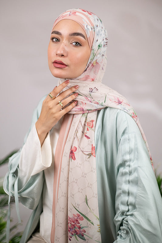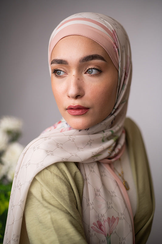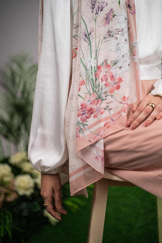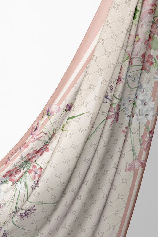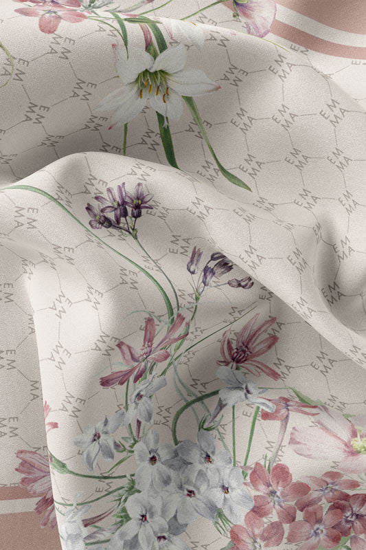 A delicate and sophisticated Parisian floral design in that perfect blush color that would make your face glow, featured on EMMA’s signature monogram print for an elevated look.
