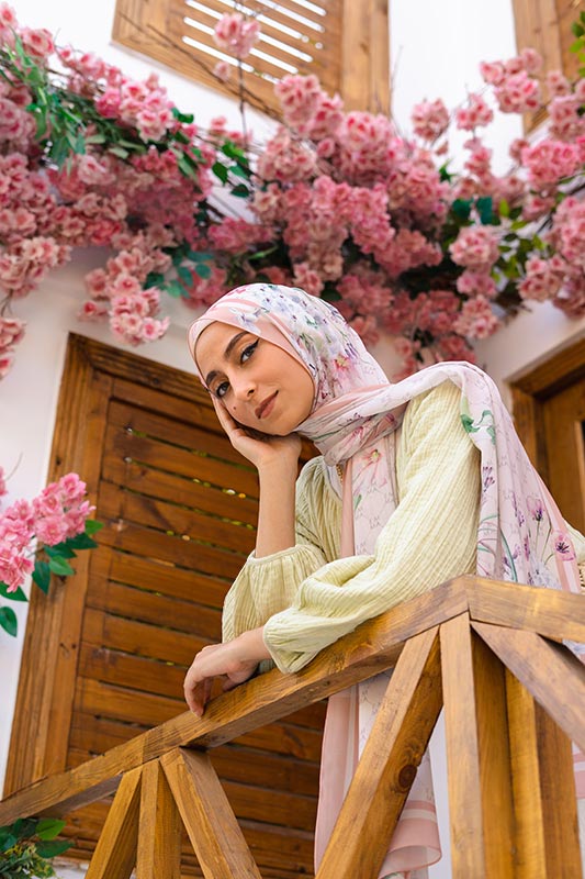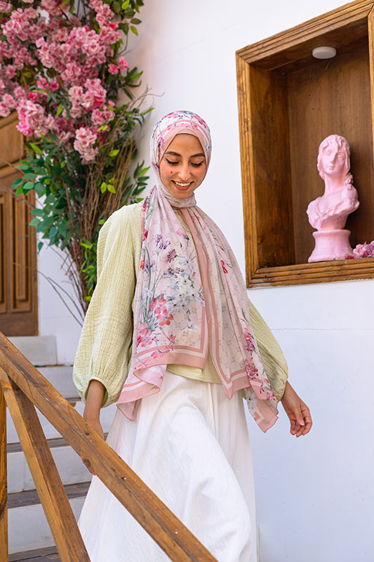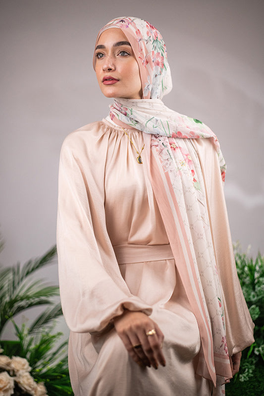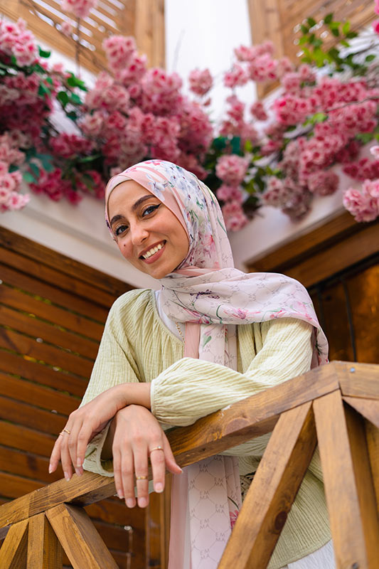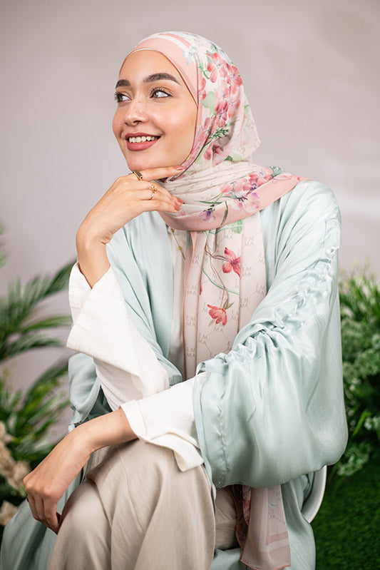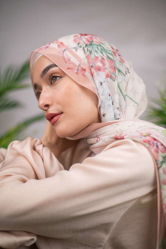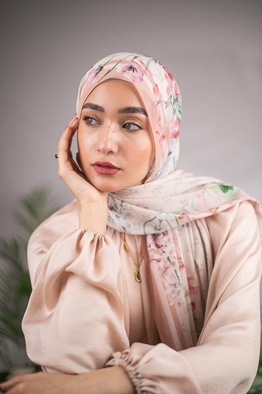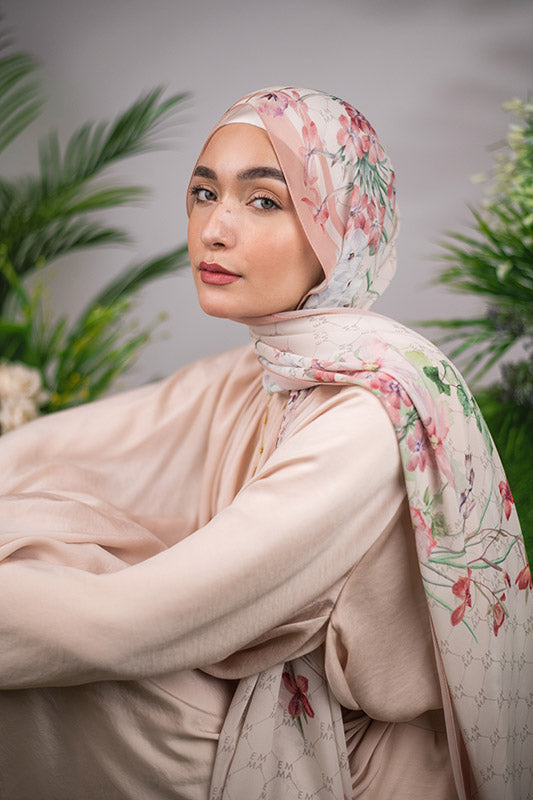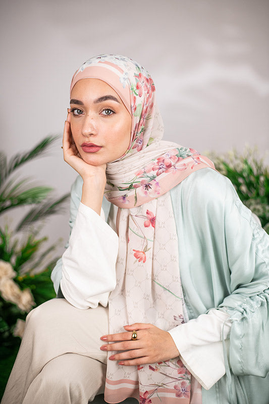 A delicate and sophisticated Parisian floral design in that perfect blush color that would make your face glow, featured on EMMA’s signature monogram print for an elevated look.