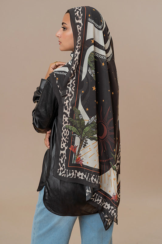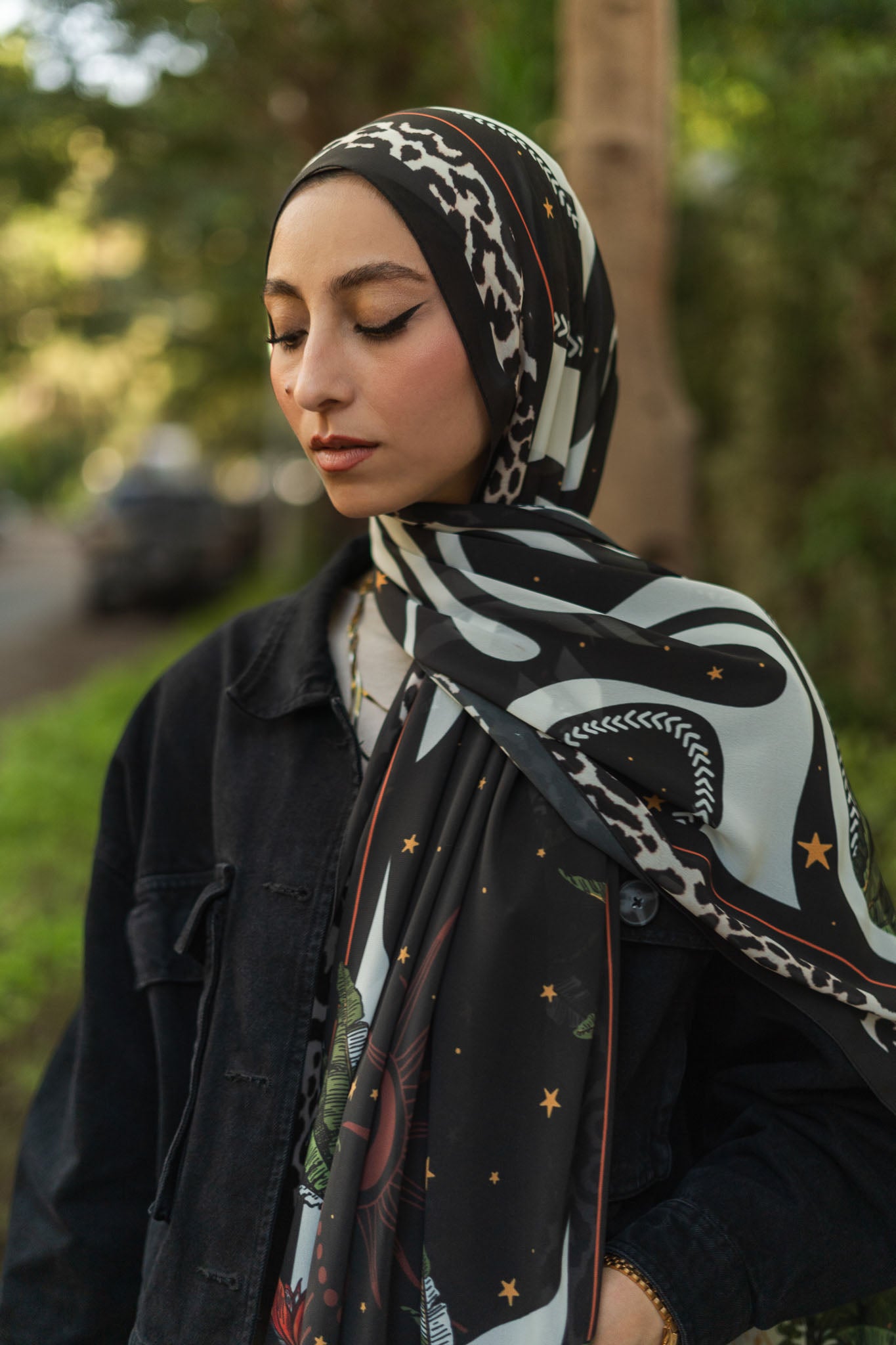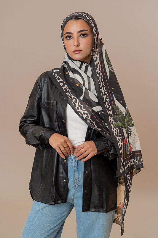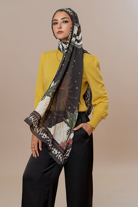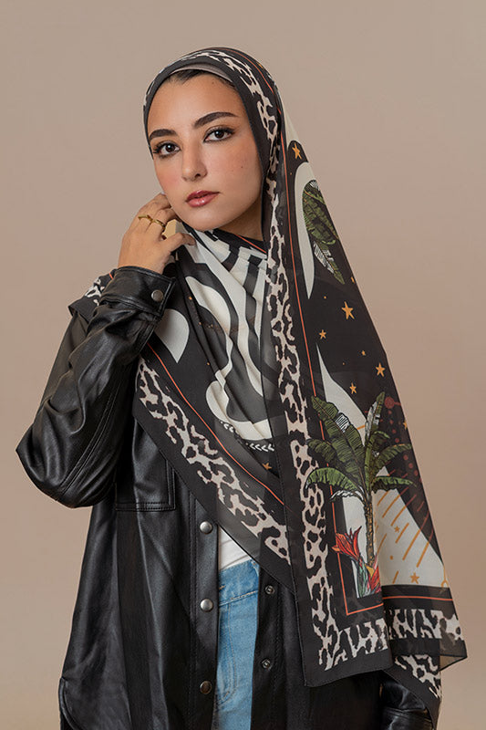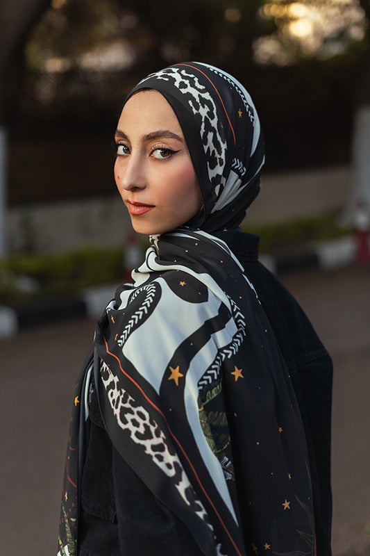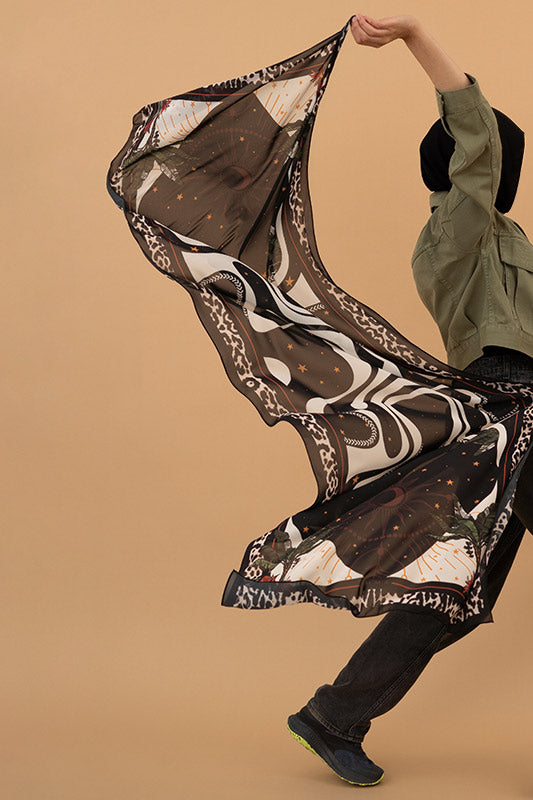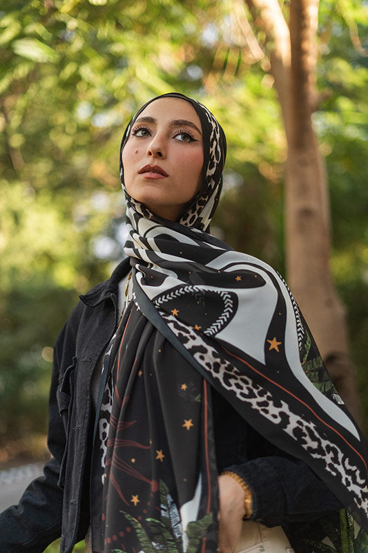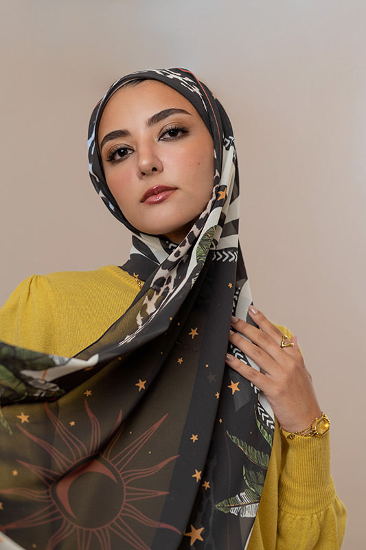 Printed chiffon with bold star motifs — lively expressive and artful in every layer.