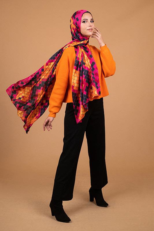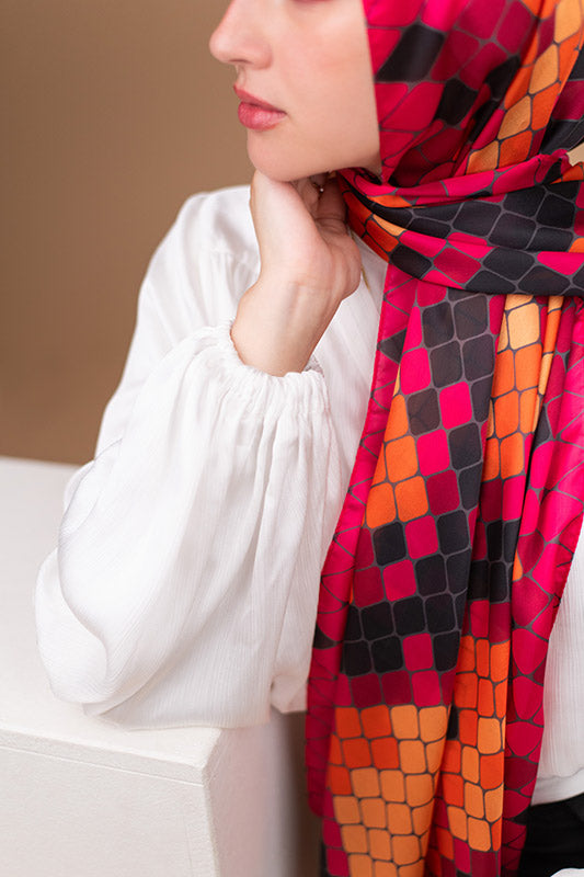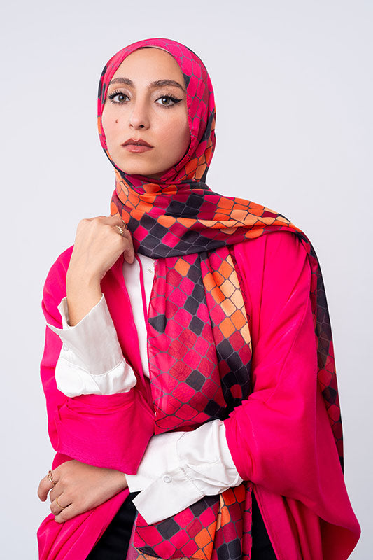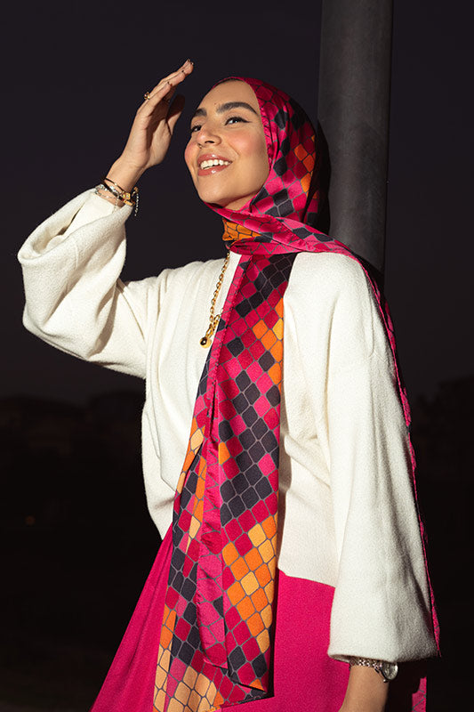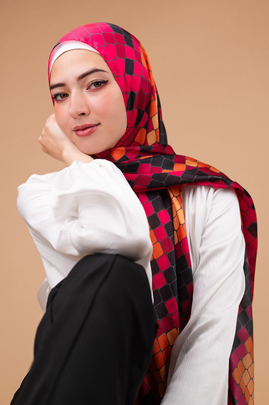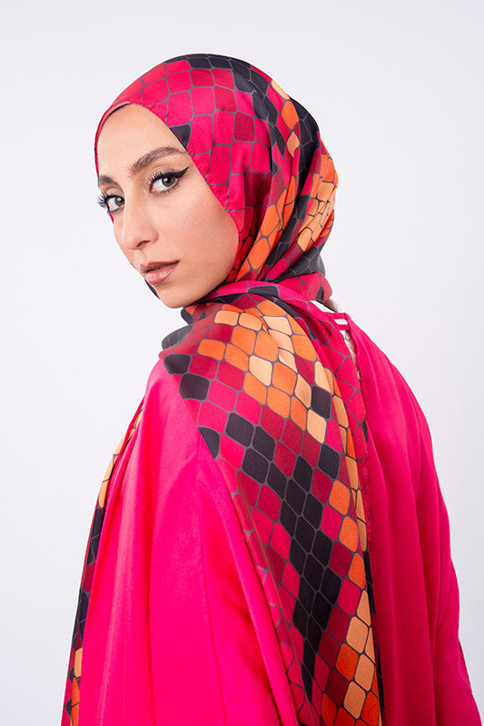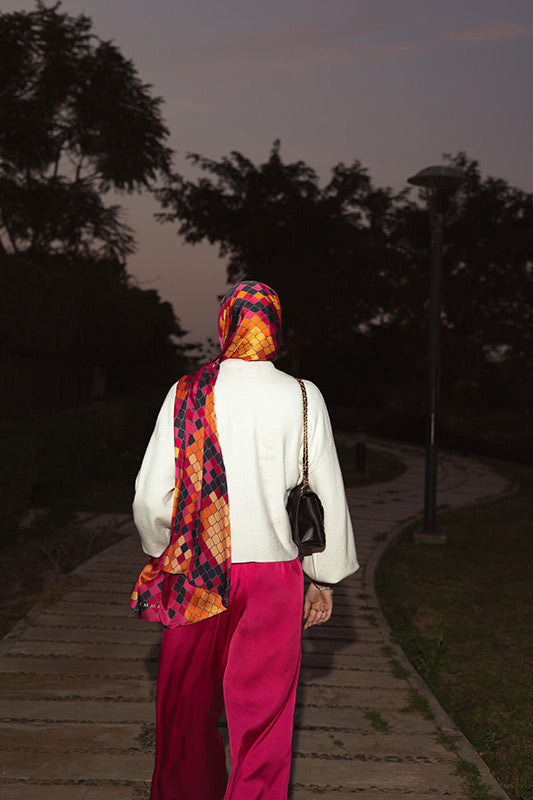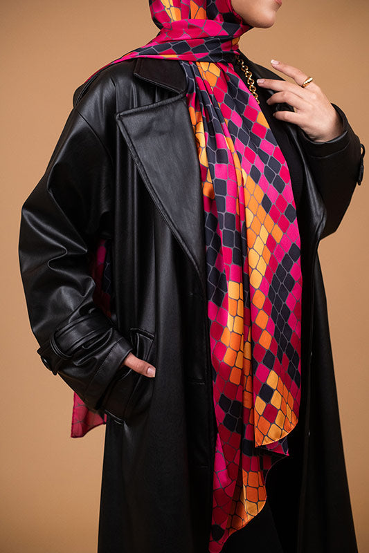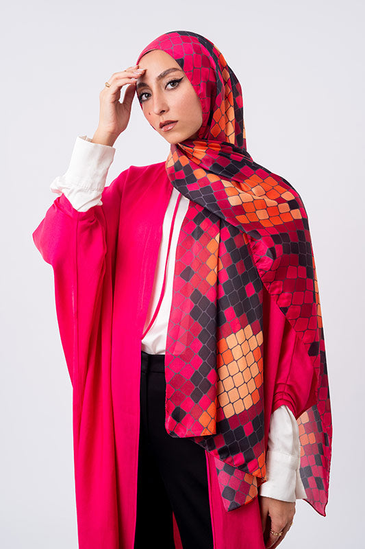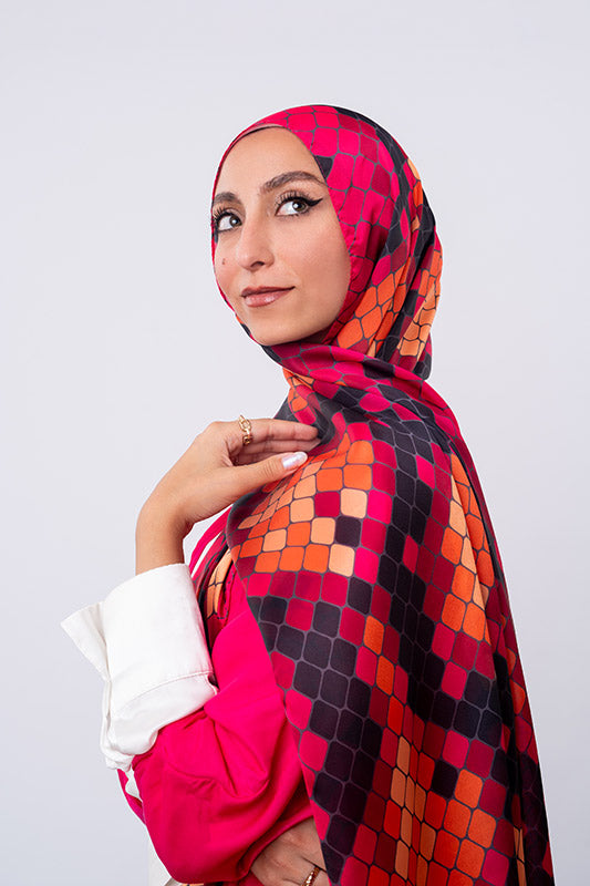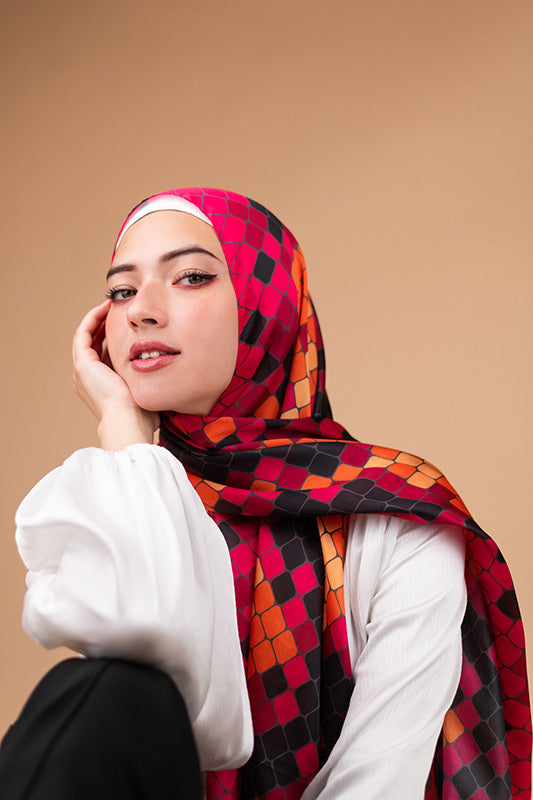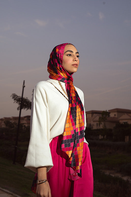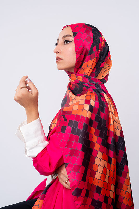 A vivid purple satin print — bold colourplay meets graceful sheen and luxe fluidity.